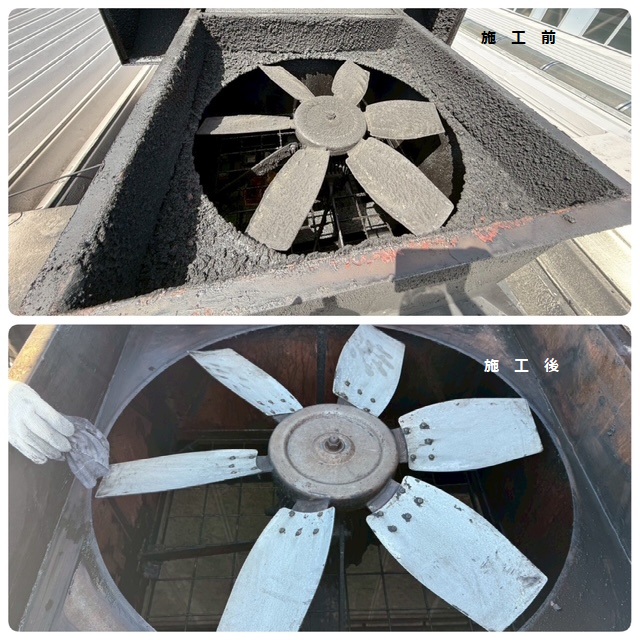長年の稼働により、羽根や内部に油汚れ・粉塵・カーボンなどが蓄積し、換気効率が低下していました。放置するとモーターの負荷が増大し、故障や異臭の原因にもなるため、定期的な清掃が欠かせません。