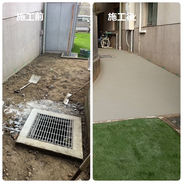 今回の施工では、まず対象箇所を整地し、下地を整えたうえで、コンクリート舗装を実施しました。